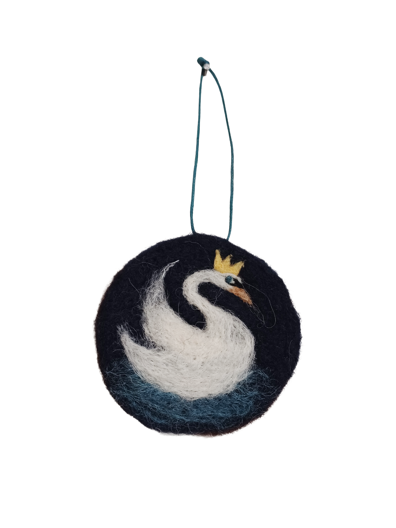 This needle felted Swan decoration is made entirely from Shetland wool and hangs from a dark brown strong waxed cotton cord. The back of the decoration is blank.