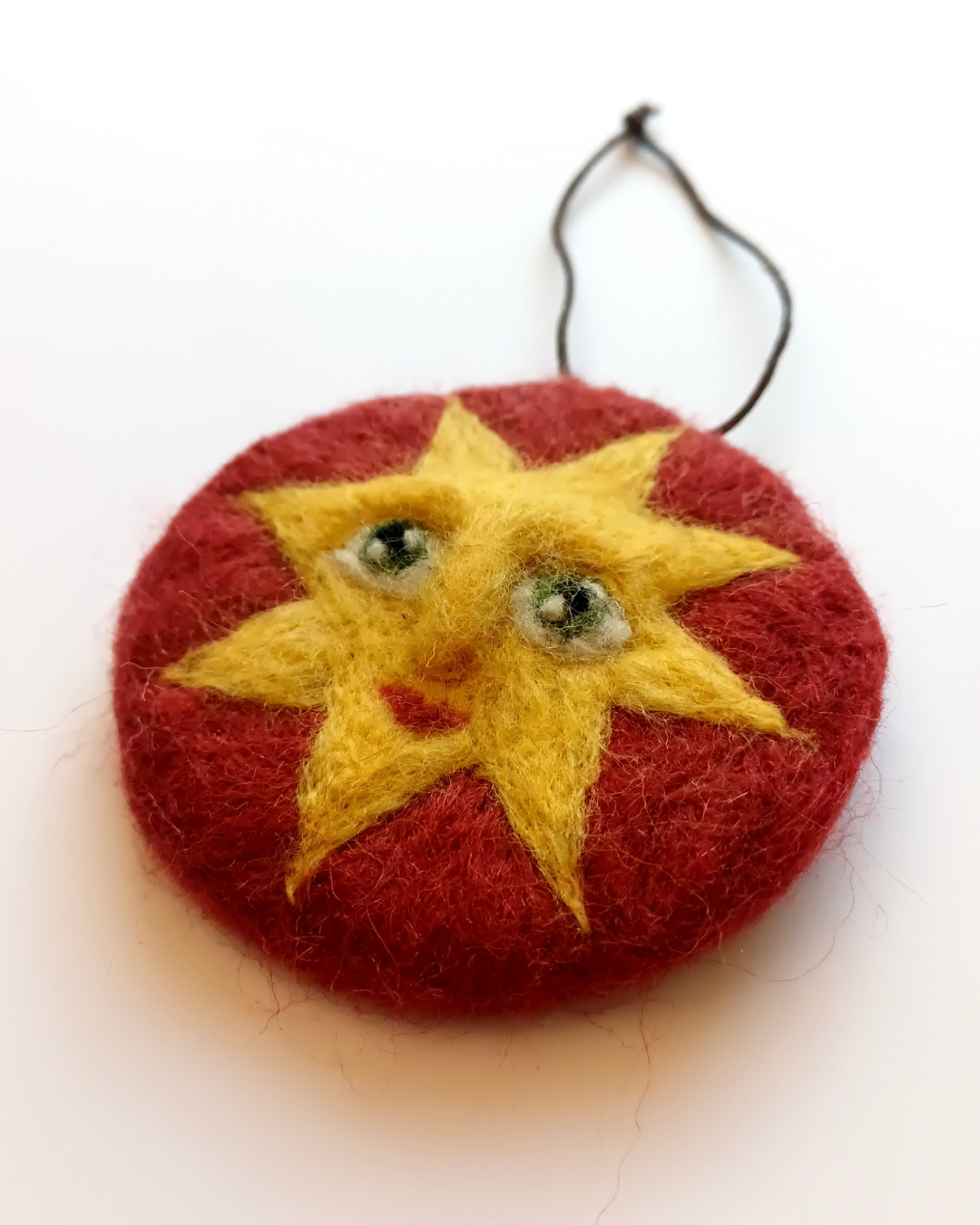 This needle felted sun face decoration is made entirely from Shetland wool and hangs from a dark brown strong waxed cotton cord. The back of the decoration is blank.